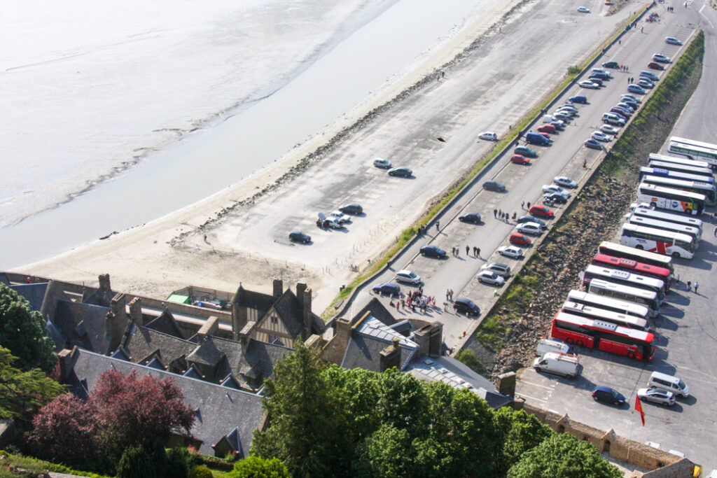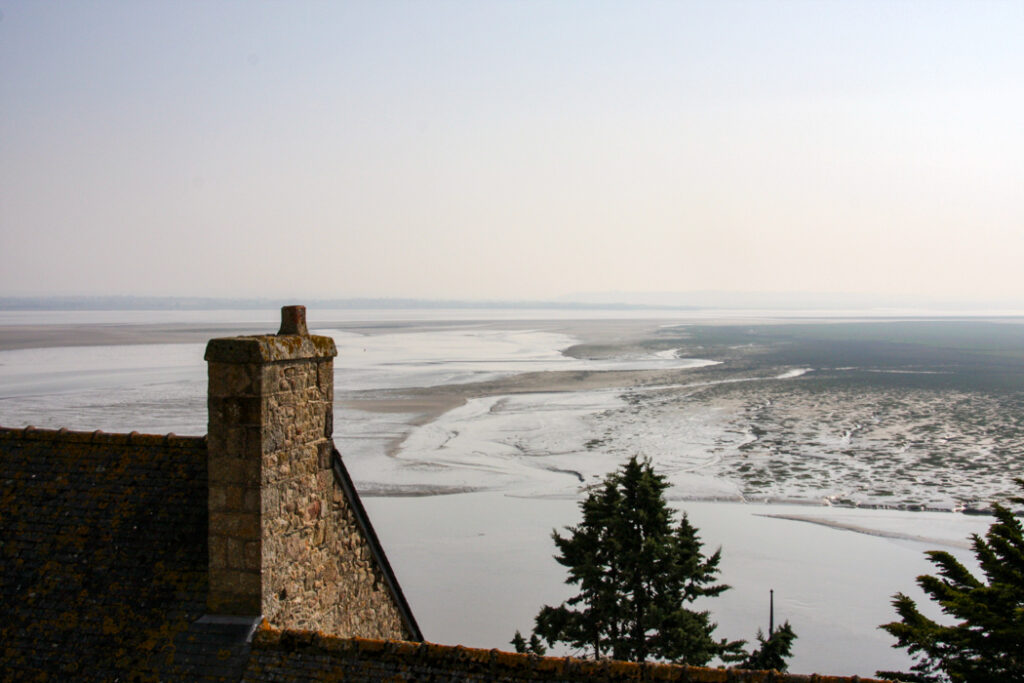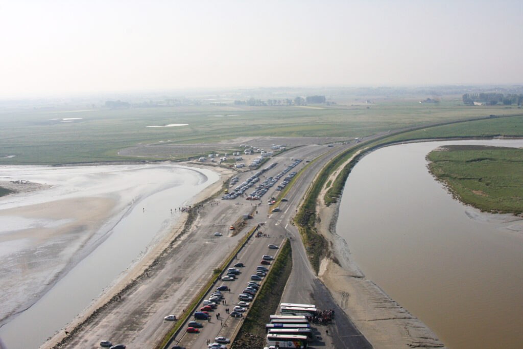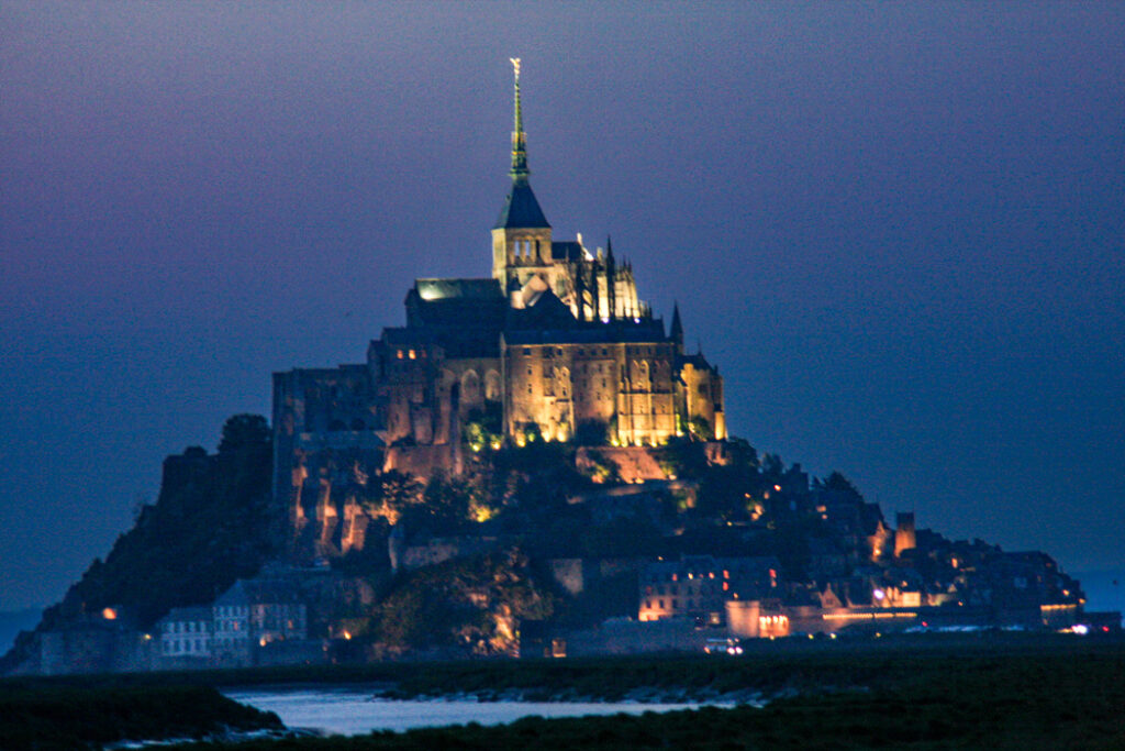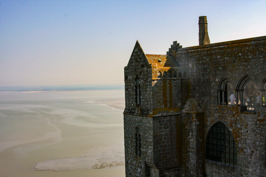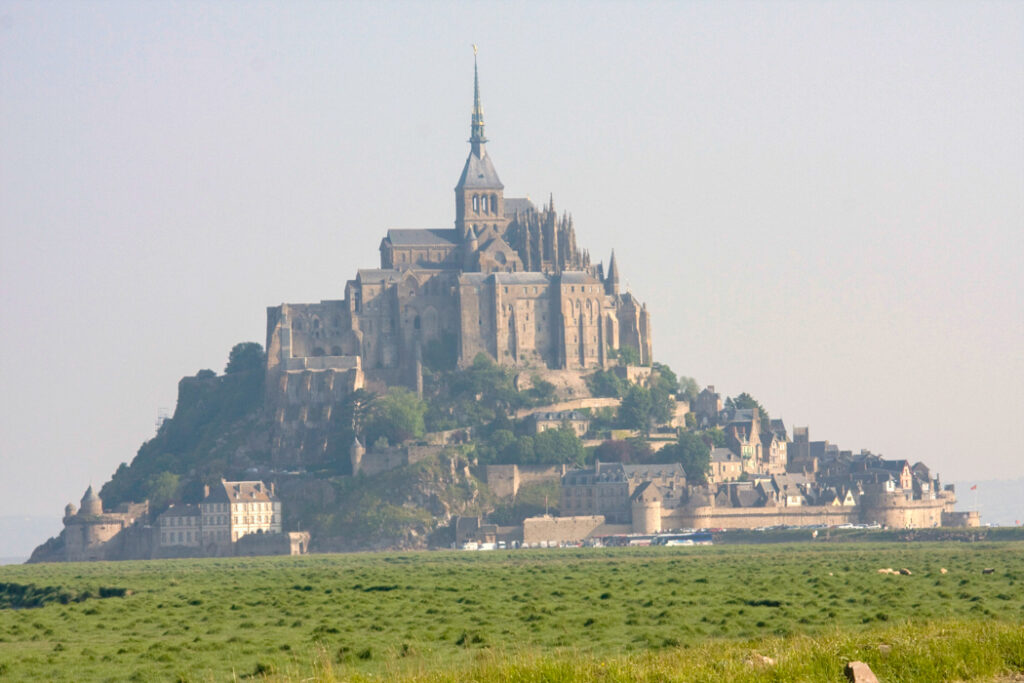 フランス西海岸のノルマンディー地方にある、潮の満ち引きによって陸と海が入れ替わる神秘的な小島と、その上にたつ壮大な修道院のことで、「西洋の驚異」や「海上のピラミッド」とも称され、1979年にユネスコ世界遺産に登録されています。大天使ミカエルのお告げによって創建された歴史を持ち、中世の面影を残す街並みや、名物のオムレツも人気です。私が行った2008年は堤防通路の影響により島の周囲が砂洲化したため、かつての「島」に戻す工事が行われていた時でした。駐車場となっている堤防の代わりに橋でつなぎ、海流により堆積砂を取り除くもので、潮の流れを妨げにくい脚付きの橋(長さ約760m)が2014年7月22日に開通しました。