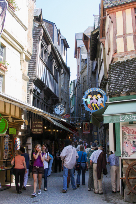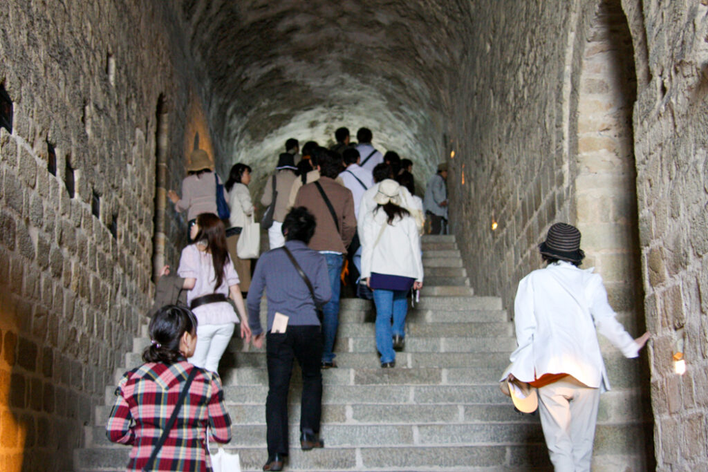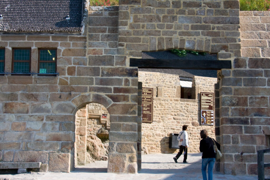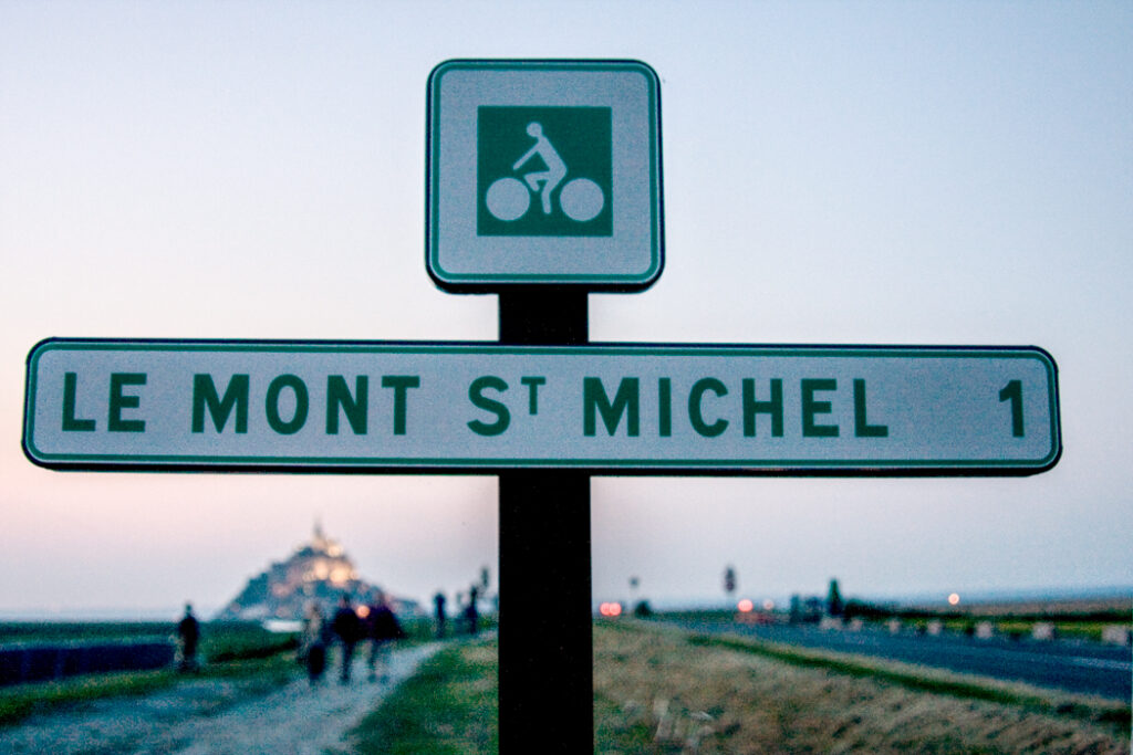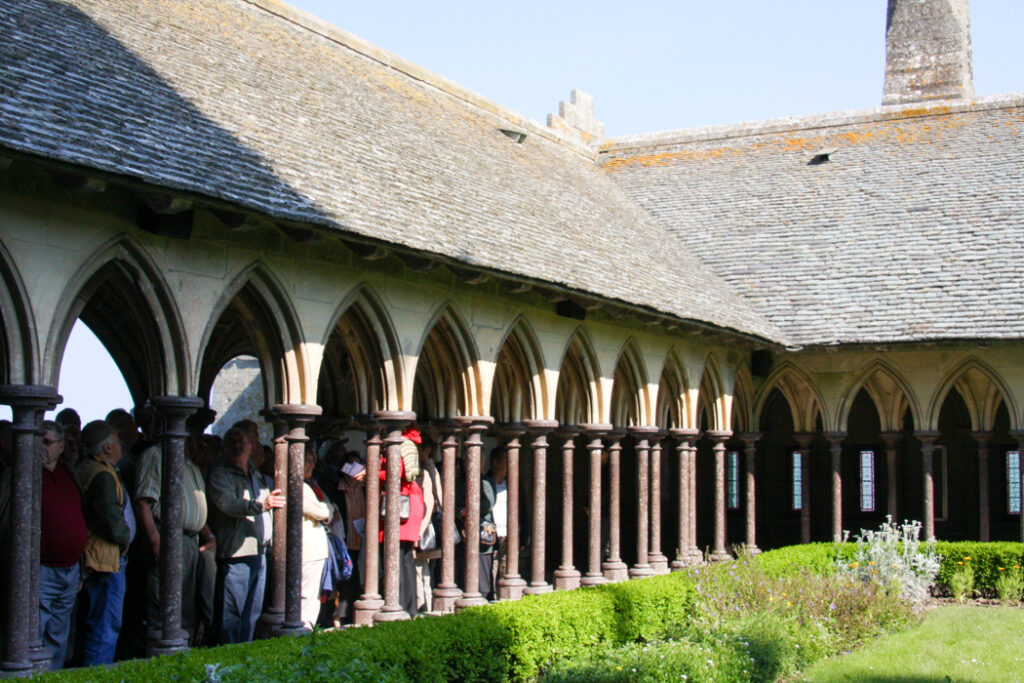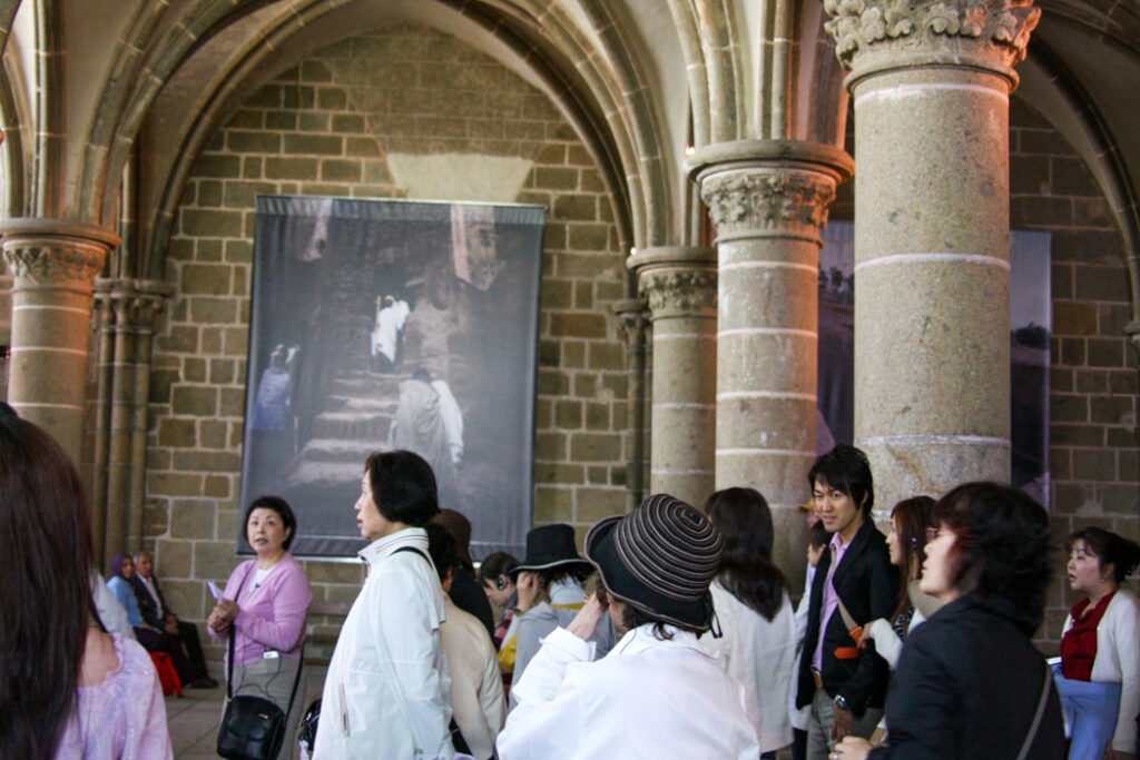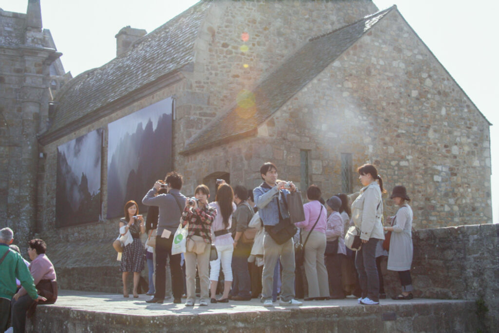 フランス西海岸のノルマンディー地方にある、潮の満ち引きによって陸と海が入れ替わる神秘的な小島と、その上にたつ壮大な修道院のことで、「西洋の驚異」や「海上のピラミッド」とも称され、1979年にユネスコ世界遺産に登録されています。大天使ミカエルのお告げによって創建された歴史を持ち、中世の面影を残す街並みや、名物のオムレツも人気です。私が行った2008年は堤防通路の影響により島の周囲が砂洲化したため、かつての「島」に戻す工事が行われていた時でした。駐車場となっている堤防の代わりに橋でつなぎ、海流により堆積砂を取り除くもので、潮の流れを妨げにくい脚付きの橋(長さ約760m)が2014年7月22日に開通しました。
